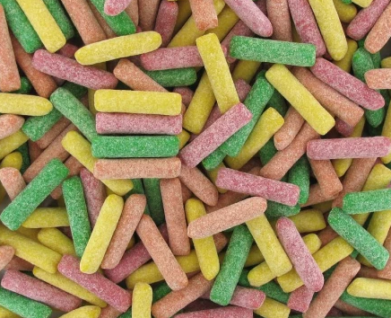 - Ingrédients : (sous réserve de modification par le fabricant) Sucre, sirop de glucose, dextrose, graisse végétales, acidifiants : acide malique, acide citrique, acide lactique, amidon modifié, gélatine (bovine), arômes, agent stabilisant : gomme arabique, émulsifiant: lécithine, colorants : (carmin, curcumine, charbon végétal médicinal, bleu brillant FCF).
